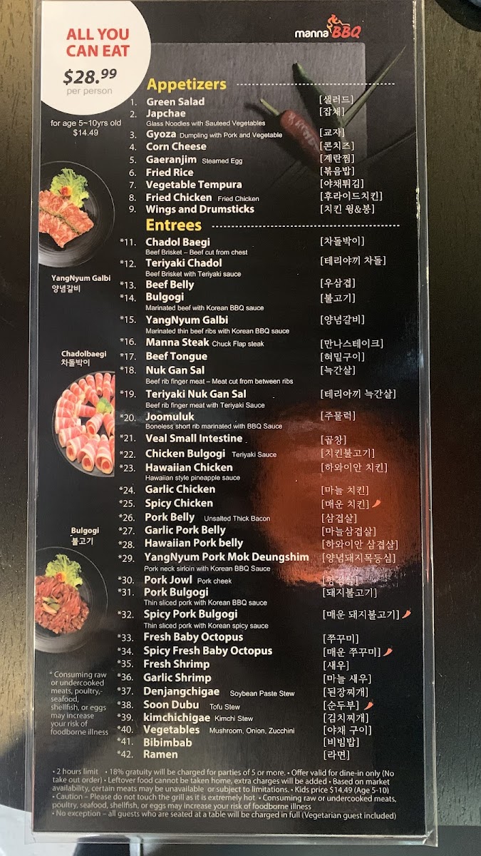 Outstanding service from staff, particularly the attentive Regina, enhances the overall experience, making guests feel cared for. Whether you are a Korean BBQ aficionado or a newcomer, Manna BBQ's simple yet comprehensive menu ensures satisfaction. Don’t miss out on the chance to indulge in an exceptional meal where quality meets warm hospitality!
